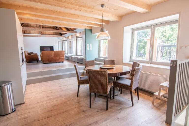 Fantastisch ruime woonkeuken. De keuken is voorzien van diverse kasten, een gasfornuis, afzuigkap, luxe mengkraan, oven, vaatwasmachine en koelkast. Op de vloer ligt een een hoogwaardige laminaatvloer.