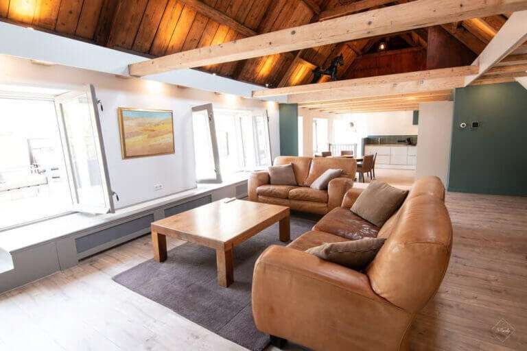 De woonkamer is iets hoger gelegen en staat in verbinding met de keuken. De woonkamer is voorzien van vele raampartijen. Hierdoor is de woonkamer super licht. Het hoge plafond geeft een ruimtelijk gevoel. De woonkamer is voorzien van diverse kasten en inbouw spots. Het dakterras is via de woonkamer te bereiken. Ook in deze ruimte ligt er de luxueuze laminaatvloer.