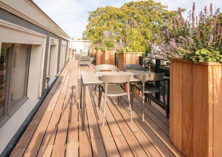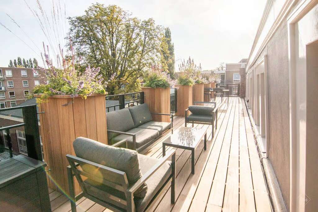 Via de woonkamer is het dakterras te bereiken. Het dakterras is ongeveer 39 m2 groot en beschikt over verschillende zitgedeeltes. Het dakterras is gelegen op het zuidwesten en beschikt daardoor over veel zon.