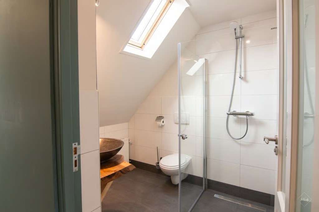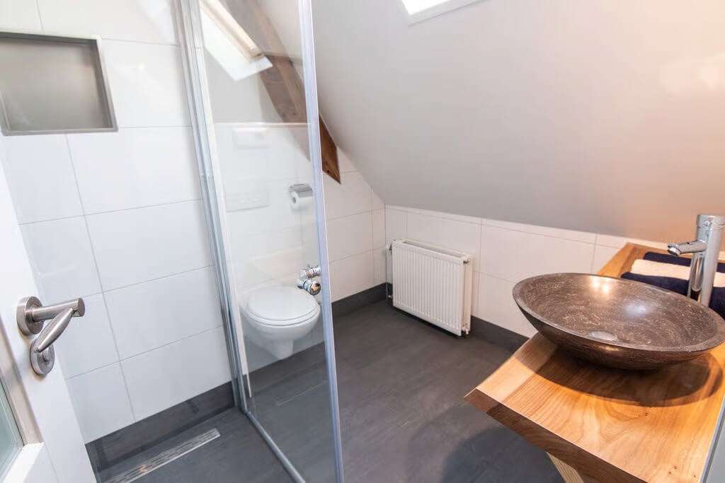 De badkamer is voorzien van een ruime douche, toilet en wastafel.