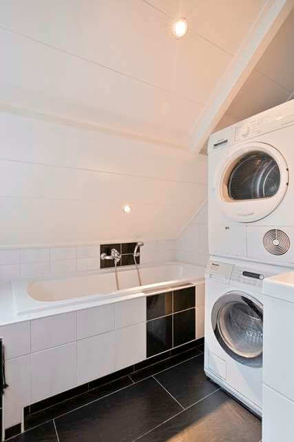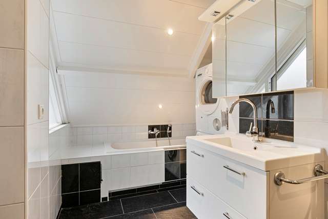 De eerste verdieping heeft drie slaapkamers. Ook is hier de badkamer aanwezig met een douche, ligbad, wastafelmeubel en toilet. Ook zijn hier de wasmachine en droger geplaatst.