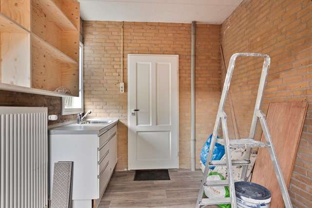 De dichte keuken is voorzien van inbouwapparatuur: inductiekookplaat, afzuigkap, koelkast met vriesvak en oven.