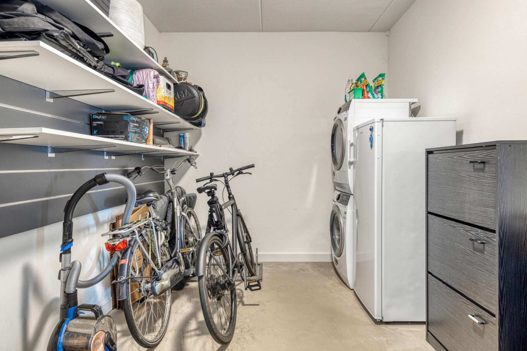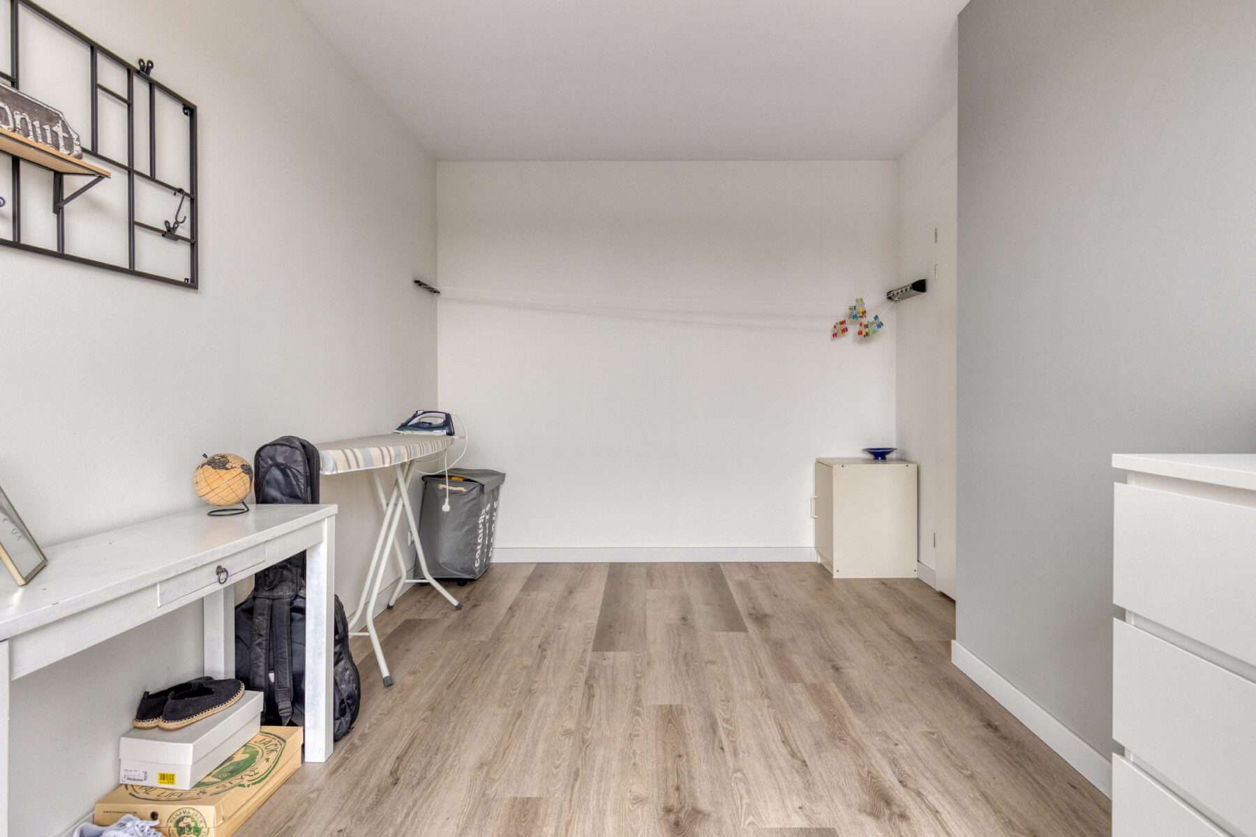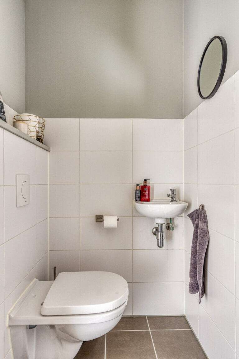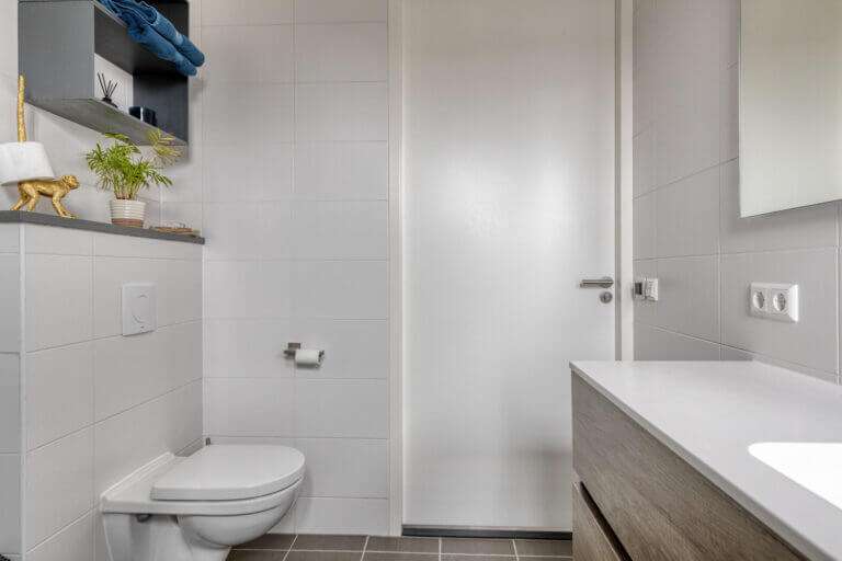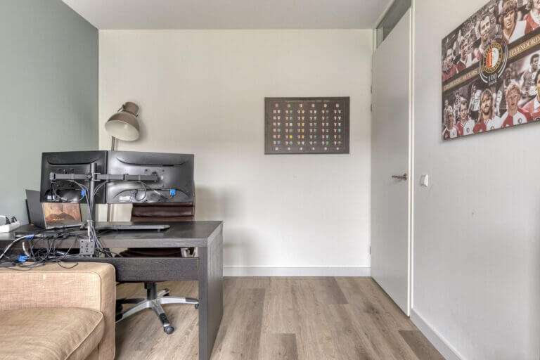 Als u via de voordeur binnenkomt treft u daar de hal. Aan uw linkerhand ziet u de ruime, lichte werkkamer annex TV kamer, voorzien van bureau en zitbankje met TV. Aan uw rechterhand een apart toilet, voorzien van moderne hangtoilet en kraantje. Als u helemaal doorloopt komt u terecht in het washok, ook te gebruiken als berging. Naast veel opbergruimte voor bijvoorbeeld fietsen, staan hier de wasmachine en de wasdroger en een extra vriezer. Hier bevindt zich tevens de deur die u weer terug naar de carport brengt.