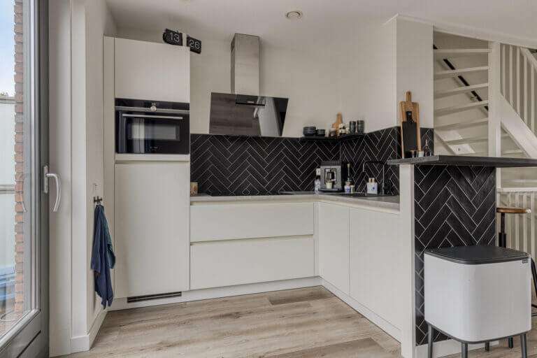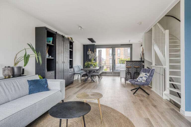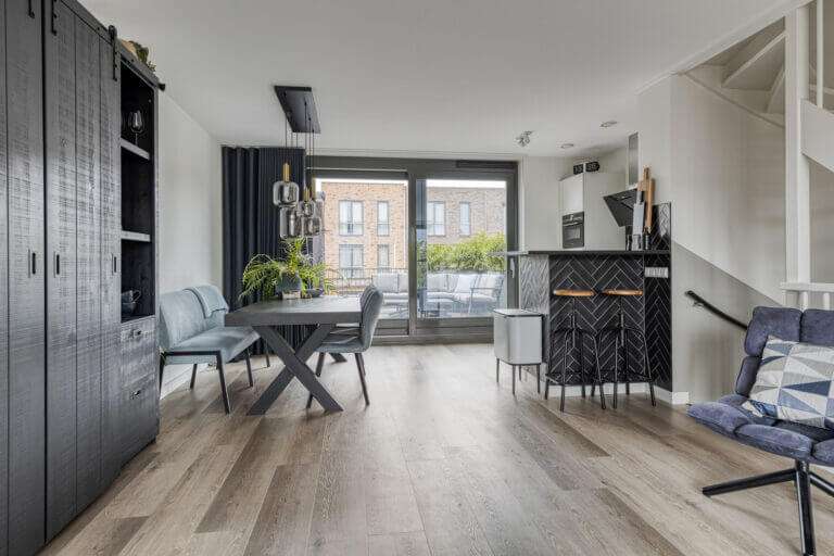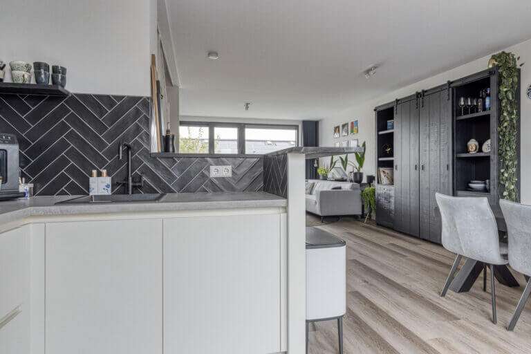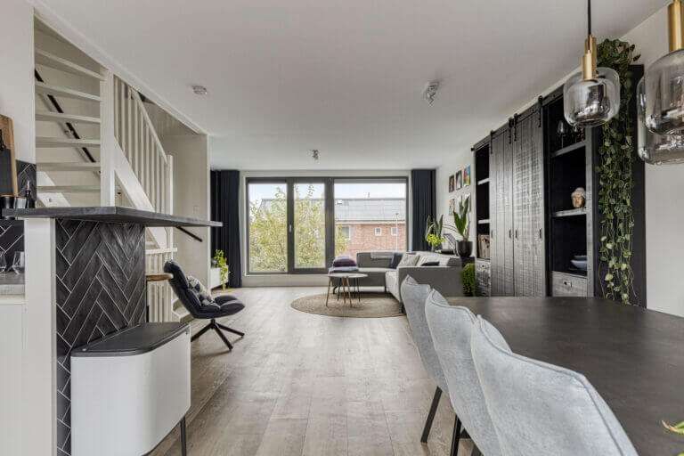 Een stukje terug, naast de wc, bevindt zich de trap die u naar de eerste verdieping brengt. Op de eerste verdieping is de woonkamer en de open keuken. Volledig volgens de huidige trends is dit een open plan leefruimte. De luxe keuken met eetbar is op strakke wijze ingebouwd en voorzien van onder andere 5 pits inductie kookplaat met afzuigkap, combi oven, vaatwasser, Quoocker kraan en koelkast. De bar brengt een visuele afscheiding in de open ruimte en is perfect voor het ontvangen van gasten.