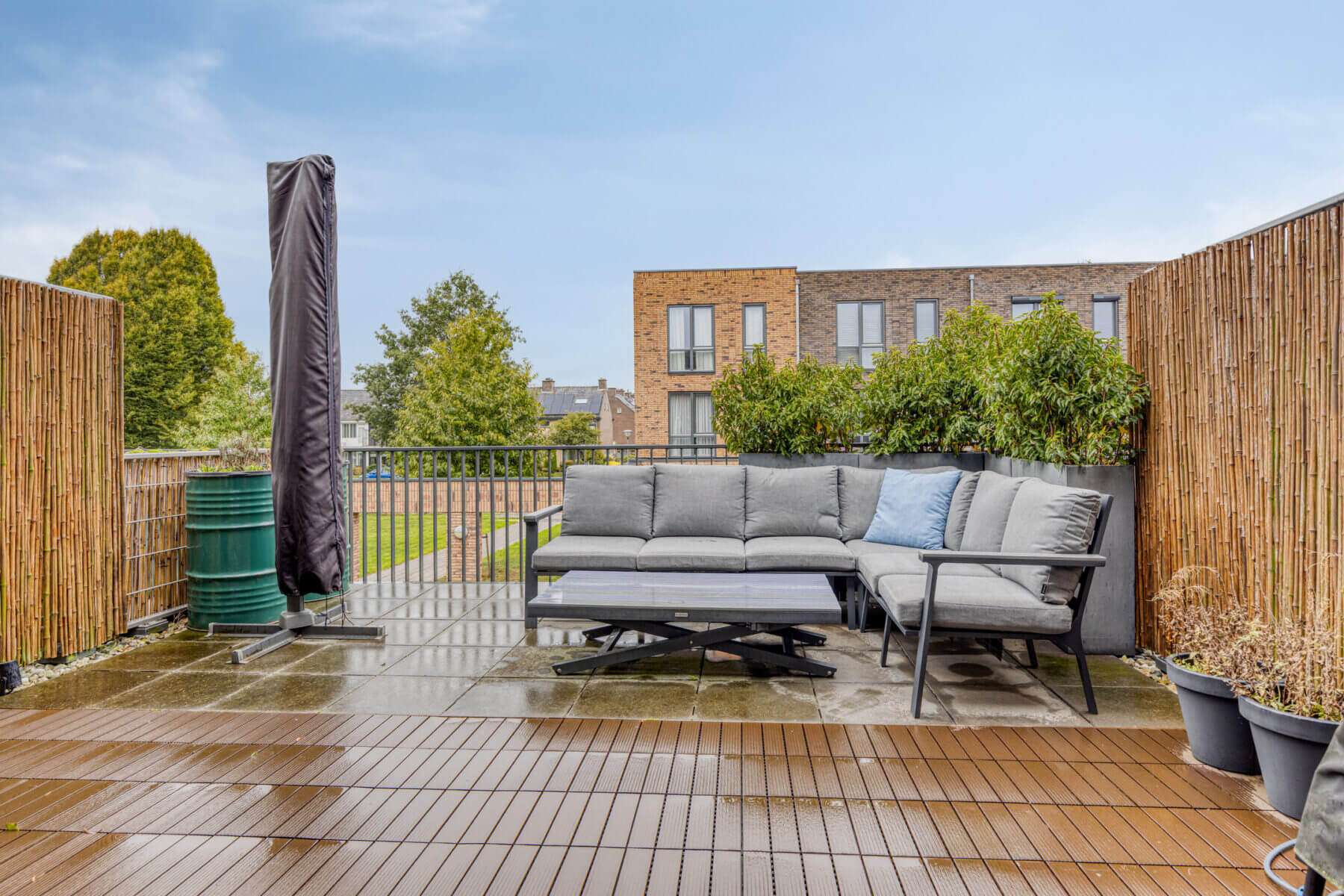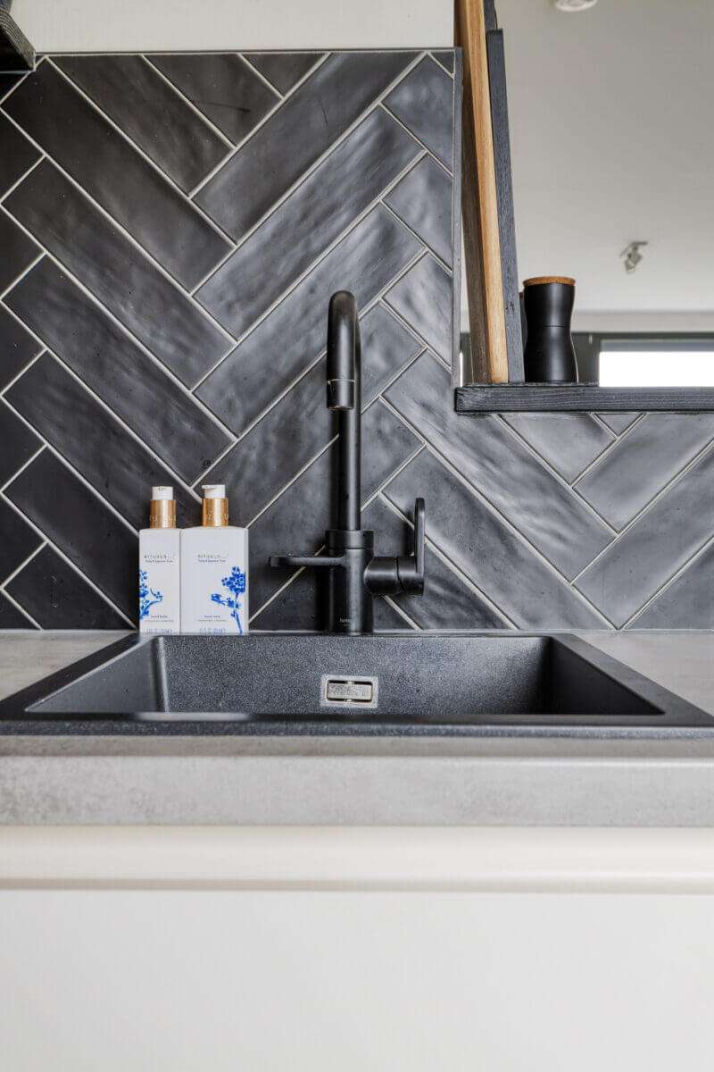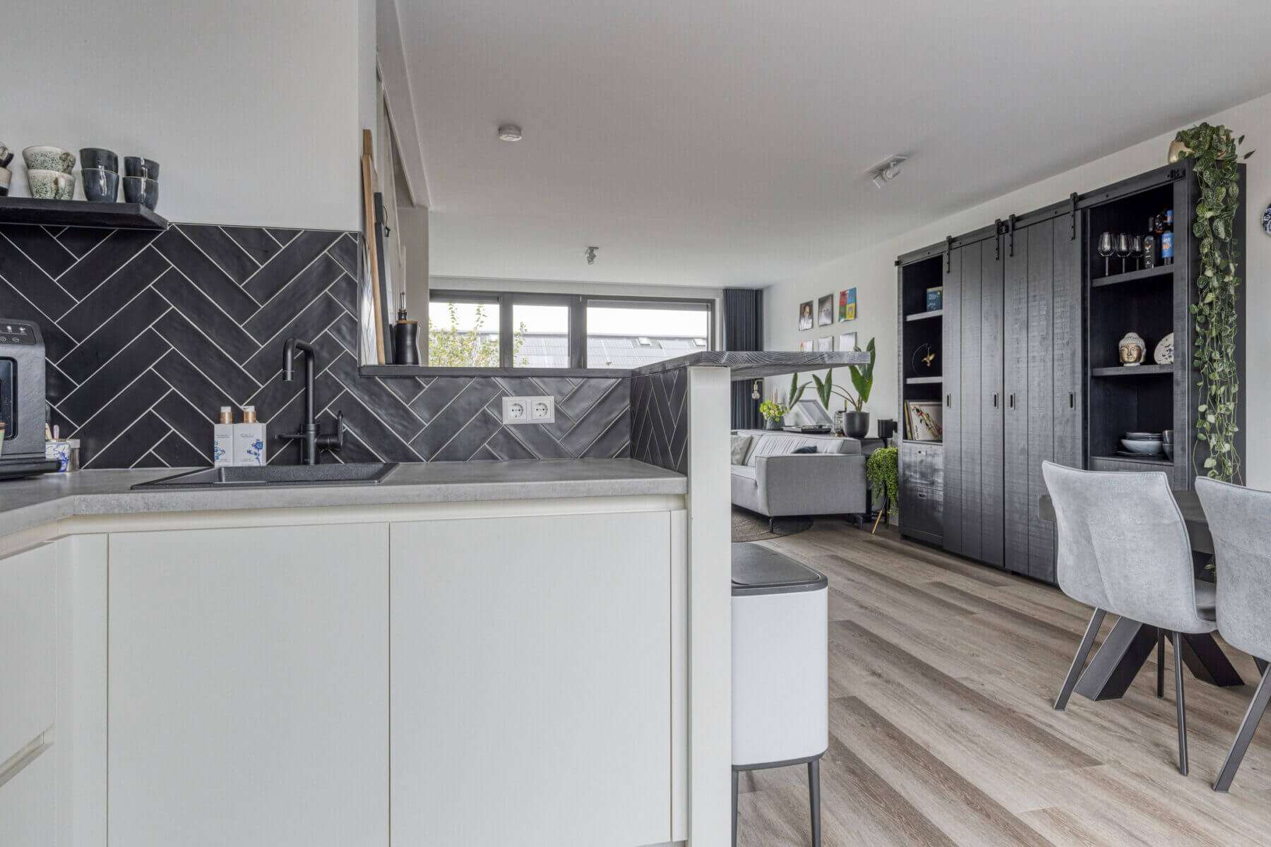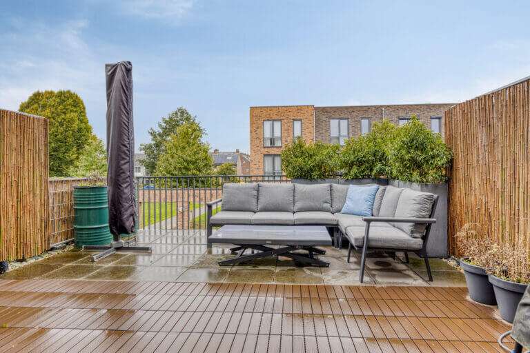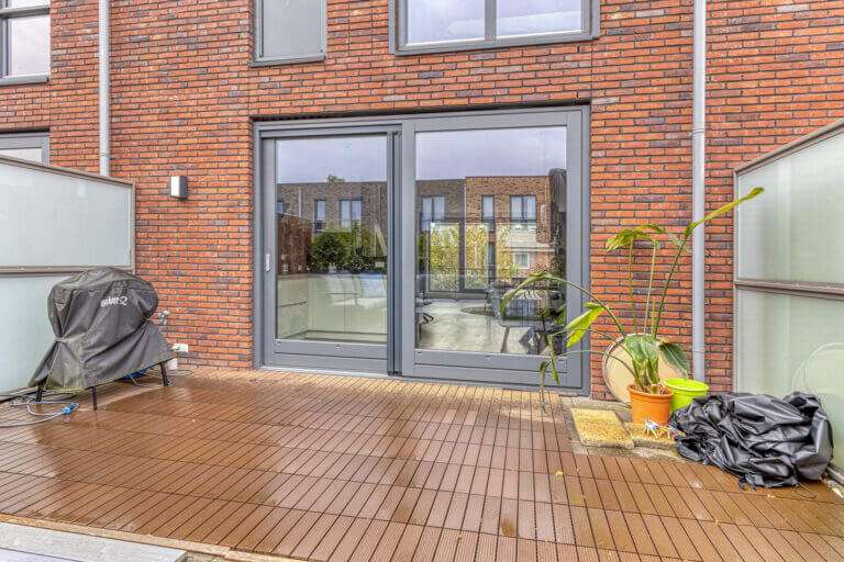 Helemaal leuk is dat je via de schuifdeuren bij de keuken het ruime zonneterras kunt betreden. Als de zon schijnt verplaats je hierdoor met je gezelschap makkelijk naar buiten, terwijl je met regen nog kunt genieten van de frisse lucht terwijl je aan de bar binnen een drankje drinkt. Een soort Nederlandse vertaling van het Californische ‘indoor outdoor living’, waarbij de buitenruimte gevoelsmatig tot verlengstuk van de binnenruimtes wordt gemaakt.