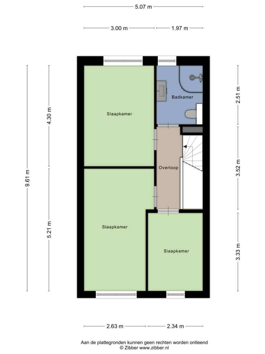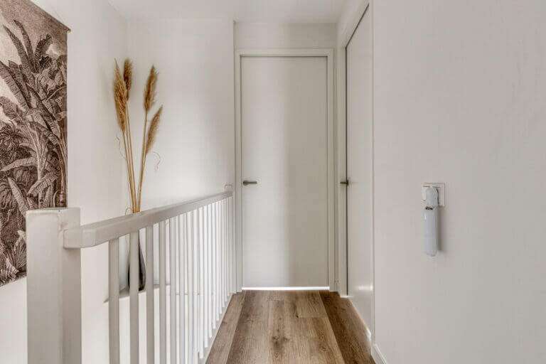 Als je via de trap nog een verdieping omhoog gaat, kom je op de tweede en tevens bovenste etage. Hier bevinden zich de badkamer en 3 slaapkamers. De badkamer is voorzien van een douche, toilet, wastafelmeubel met zwevende spiegel.