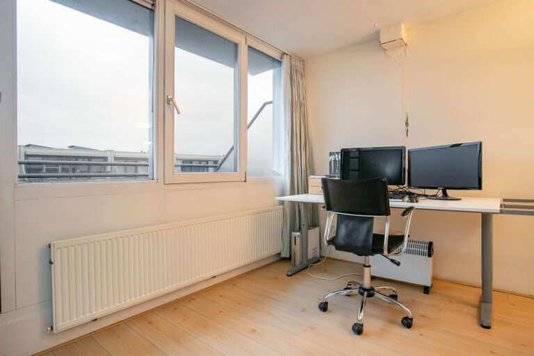 Via een vaste trap bereikt u de tweede verdieping met twee grote kamers. Deze kamers zijn nu in gebruik als kantoorruimte ,maar kunnen uiteraard ook worden gebruikt als slaapkamers. Vanuit iedere kamer heeft u toegang tot een ruim balkon. Deze verdieping is bijzonder verbouwd. Een van de kamers is voorzien van een lichtstraat waardoor in het gehele trappenhuis een prachtige lichtinval hebt. De lichtstraat is overigens zodanig geconstrueerd dat u er gewoon overheen kunt lopen, waardoor deze niets af doet aan het bruikbaar woonoppervlak.