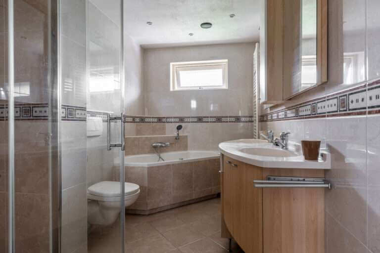 Er zijn drie ruime slaapkamers aanwezig. Waarvan één slaapkamer is ingericht als werkkamer. De keurige badkamer is uitgerust met een dubbel wastafelmeubel, een douche, luxe bubbelbad/jacuzzi en een zwevend toilet.