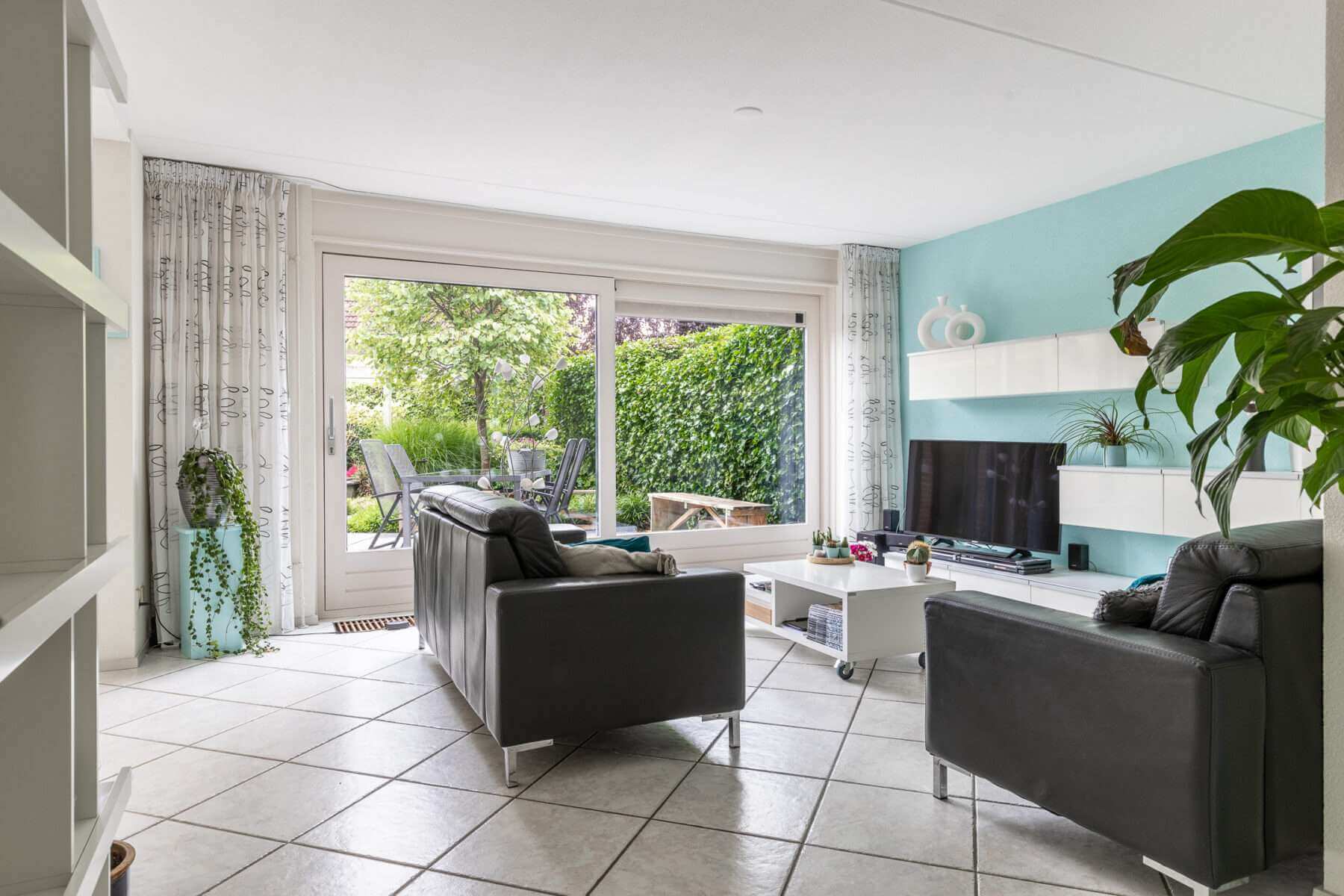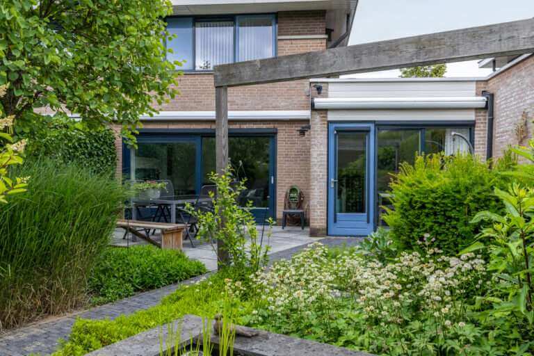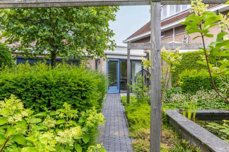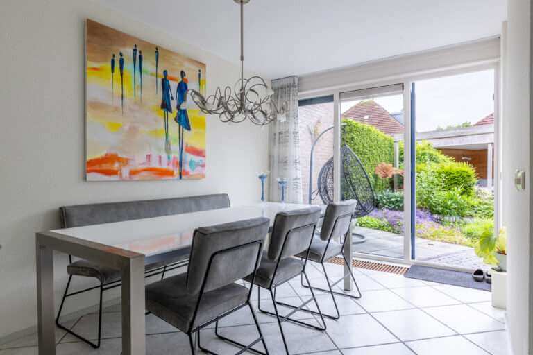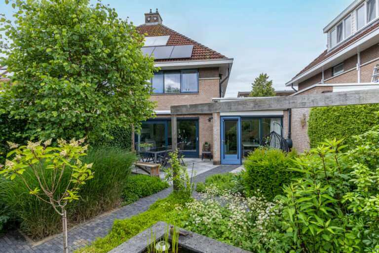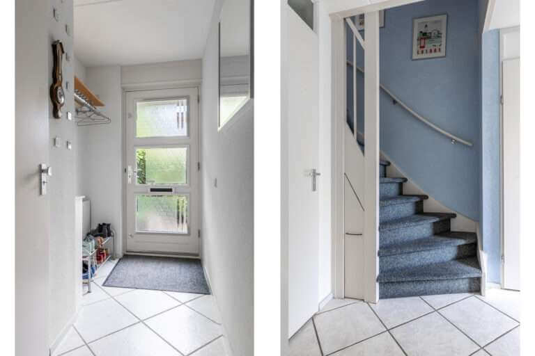 Hal en toilet. Vanuit de hal loop je door naar de uitgebouwde royale woon- en eetkamer met grote raampartijen die een stortvloed aan natuurlijk licht binnenlaten en bovenal vanuit alle standpunten een heerlijk uitzicht op de tuin bieden. vanuit de woonkamer heb je toegang tot de zonnige tuin.