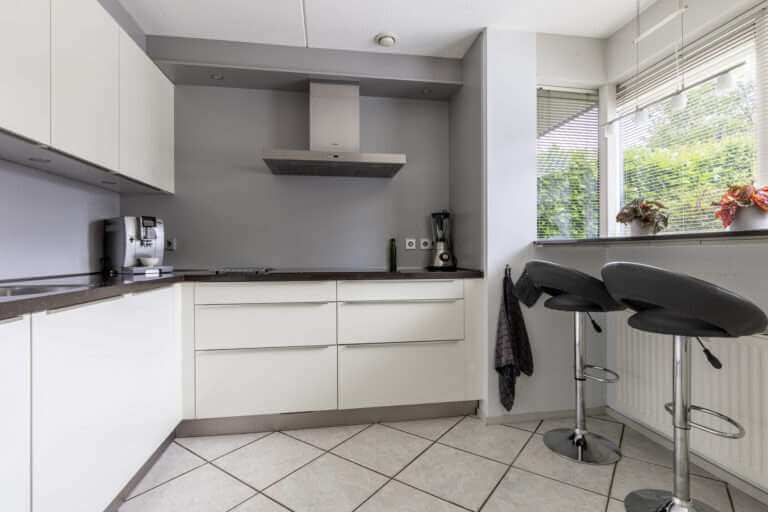 De moderne dichte keuken is voorzien van diverse inbouwapparatuur zoals: koelkast, vaatwasser, inductiekookplaat, afzuigkap en oven.