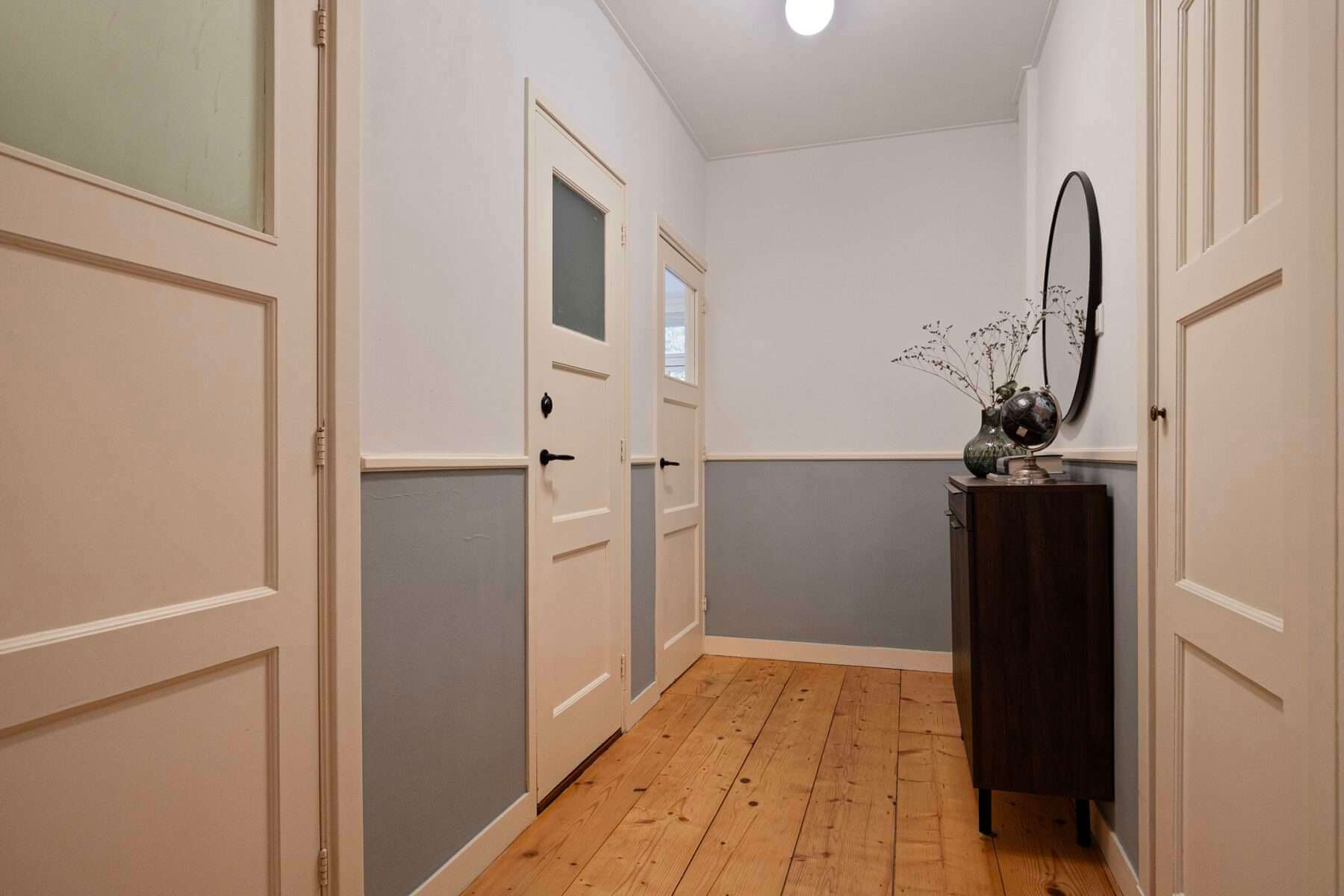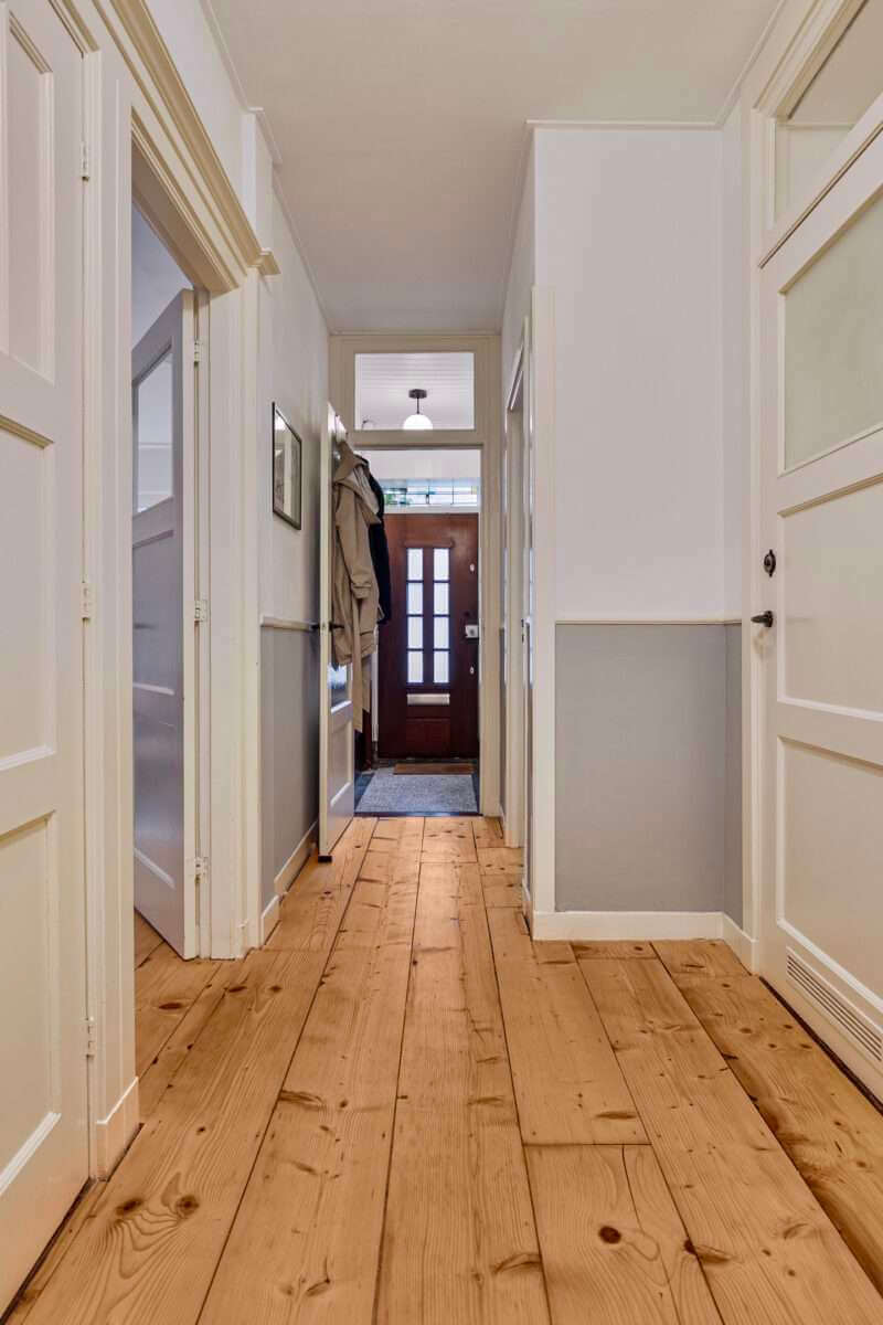 Vanuit de hal is de mooie badkamer met inloopdouche en dubbele wastafel met ombouw bereikbaar. De toegang tot het separate toilet bevindt zich tevens in de hal.