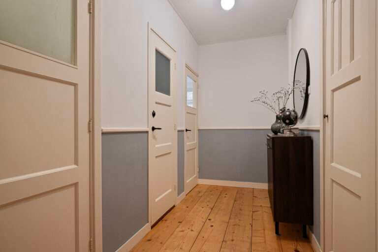 Hal met toegang tot de woonkamer, met prachtige open woonkeuken, een ruime slaapkamer en een kleinere kamer welke te gebruiken is als een kleine slaapkamer of walkin closet. Tevens vindt u op de begane grond separaat van de badkamer het toilet.