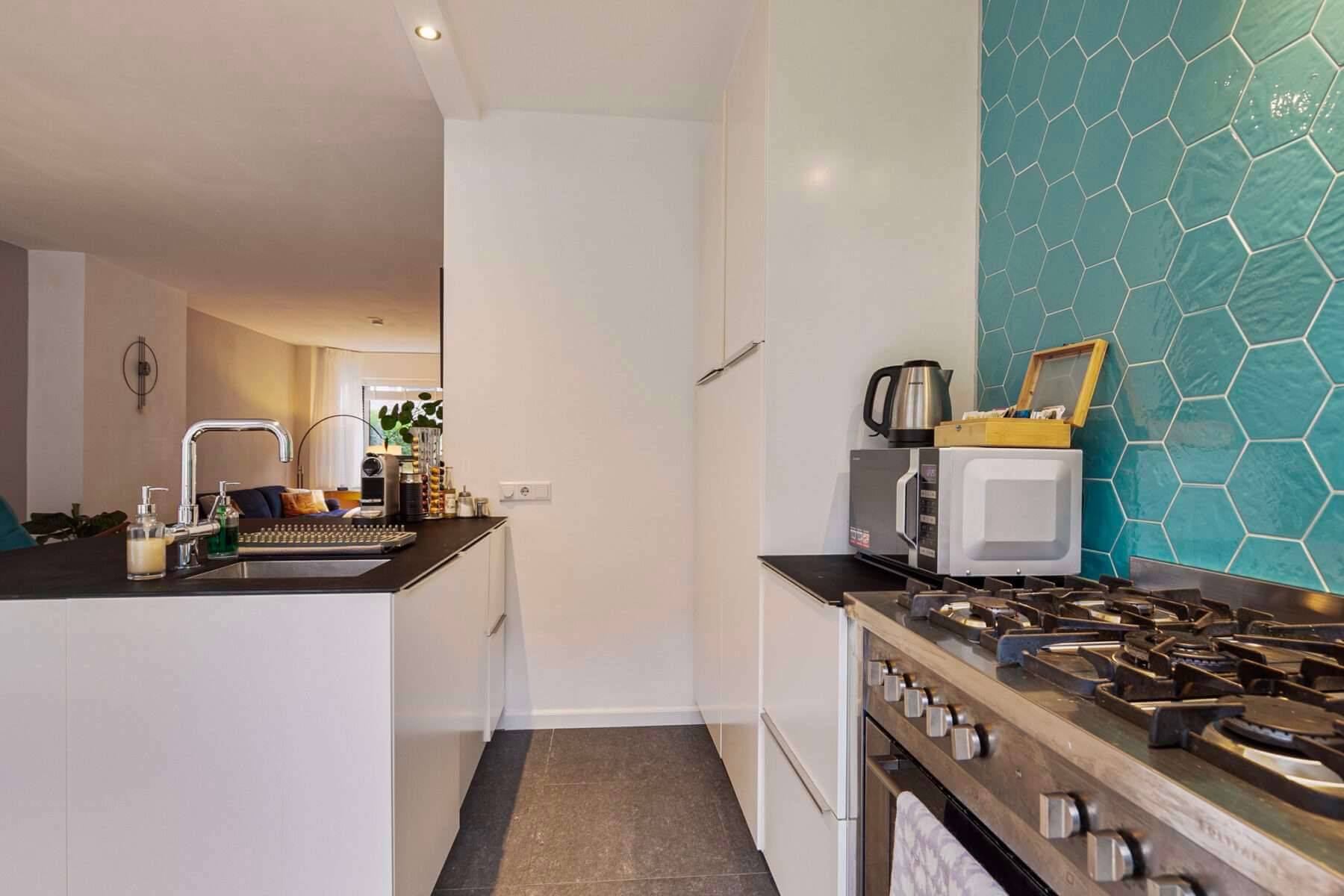De moderne keuken is volledig ingericht en voorzien van een gaskookplaat, afzuigkap, spoeleiland met spoelbak, vaatwasmachine, koelkast, grote oven, aparte magnetron en veel bergruimte. De vriezer staat momenteel in het tuinhuis. Er is echter ruimte in de keuken om de vriezer daarheen te verplaatsen. Vanuit de keuken heeft u toegang tot een fijne veranda van ongeveer 10 m2 op het noorden waardoor u nog tot laat in de middag kunt genieten van de zon.