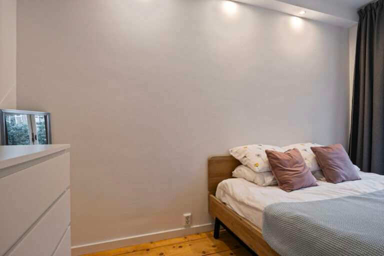 De grote slaapkamer is gelegen aan de achterzijde van de woning. Deze kamer biedt voldoende ruimte voor een tweepersoonsbed en een ladenkast.