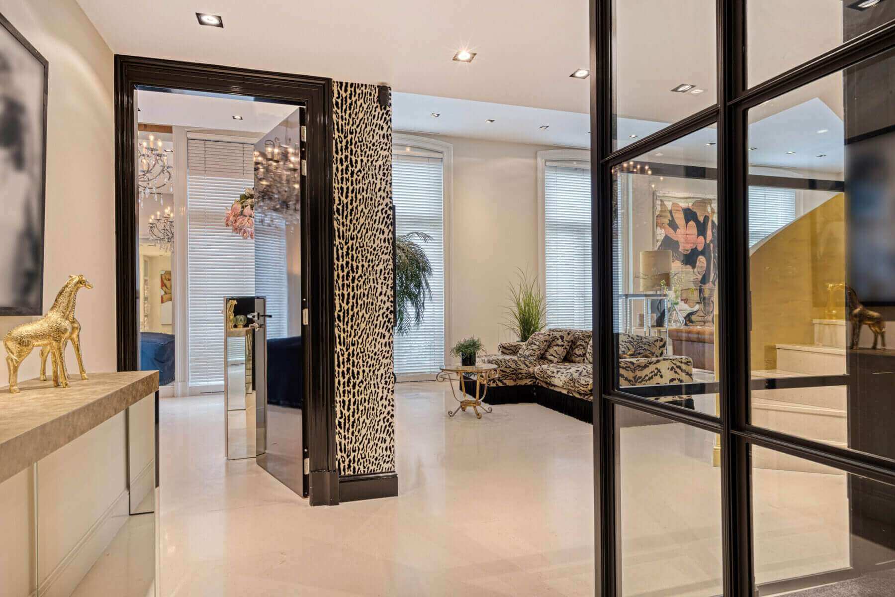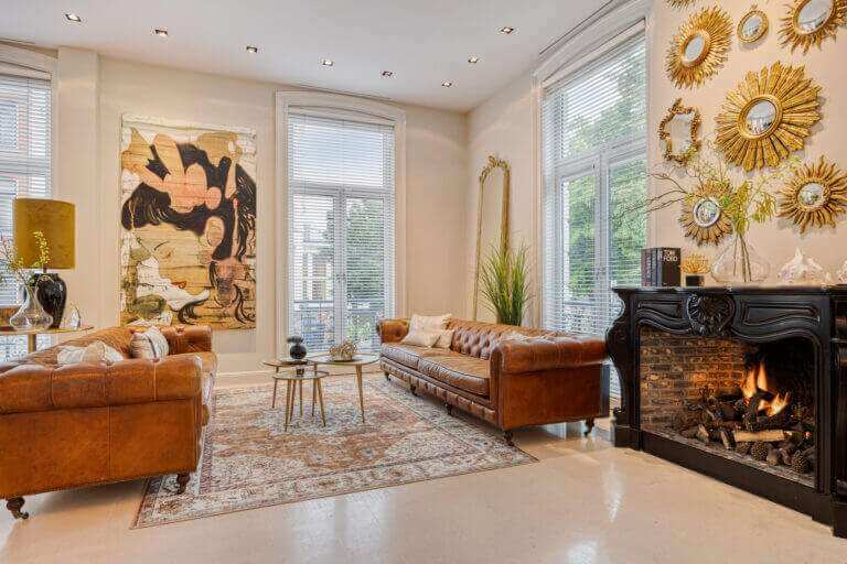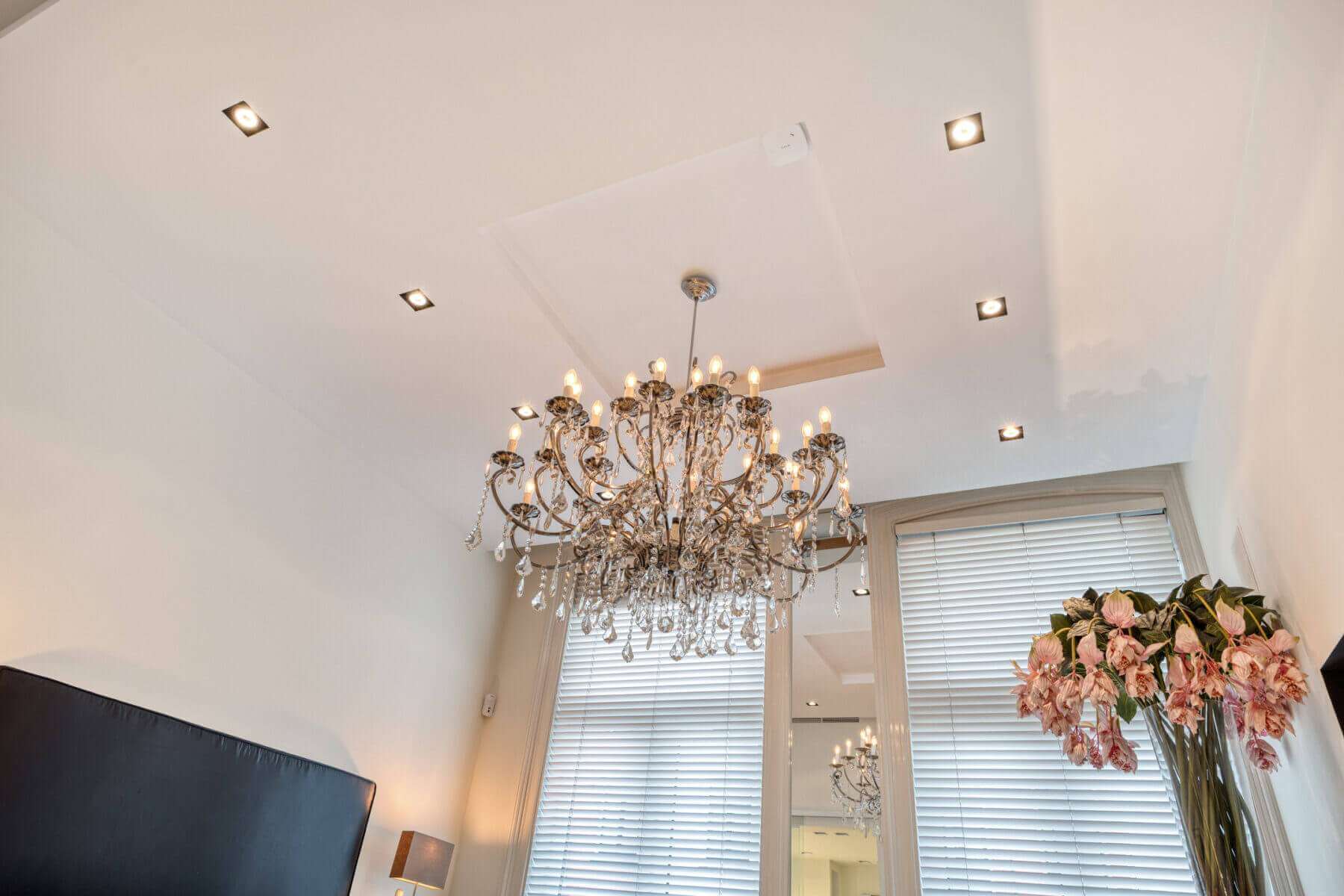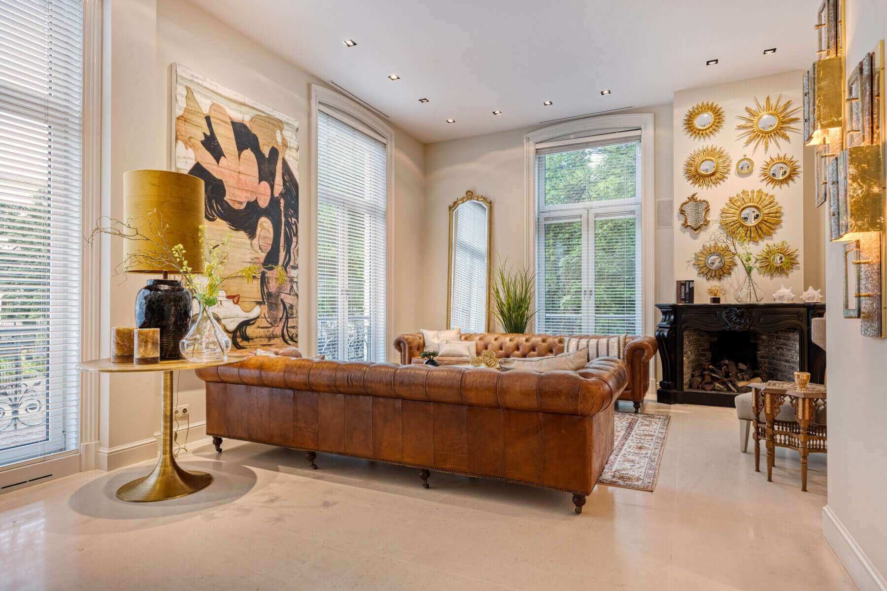 Hal met separate, ruime garderobekamer met kast- en wasruimte. Indrukwekkende woonkamer en open keuken. Vanwege de hoekligging, vele ramen en de hoogte spreekt de ruimte direct tot de verbeelding. Ieder detail is met zorg uitgekozen. De luxe keuken is voorzien van diverse inbouwapparatuur. Aansluitend aan de keuken vindt u het royale eetgedeelte met grote eettafel, waaraan heerlijk kan worden genoten van etentjes met vrienden en familie met uitzicht op het prachtige Vondelpark. De woonkamer beschikt over twee zithoeken, één waar heerlijk kan worden gerelaxt bij de haard, en de ander waar televisie kan worden gekeken. De verlichting, jaloezieën en gordijnen zijn op afstand bedienbaar en door middel van het geïntegreerde B&O muzieksysteem kan er overal muziek worden geluisterd.