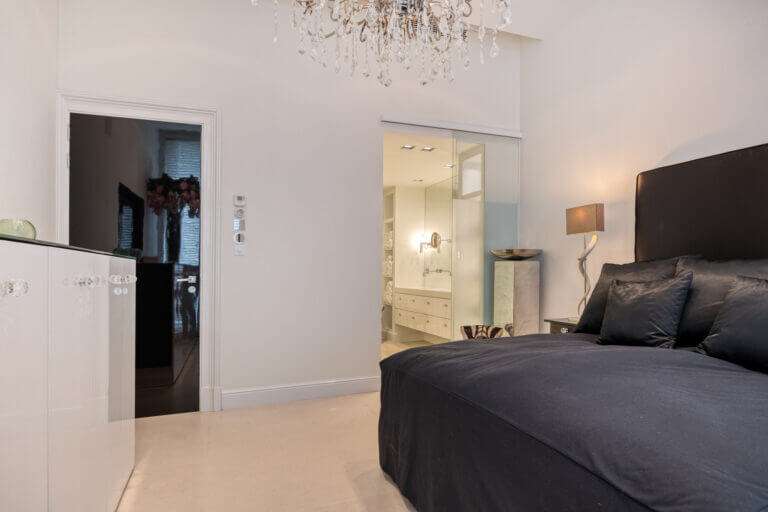 De master bedroom bevindt zich eveneens op deze verdieping met aangrenzend een royaal bemeten badkamer voorzien van dubbele wastafels, inloopdouche en apart toilet.