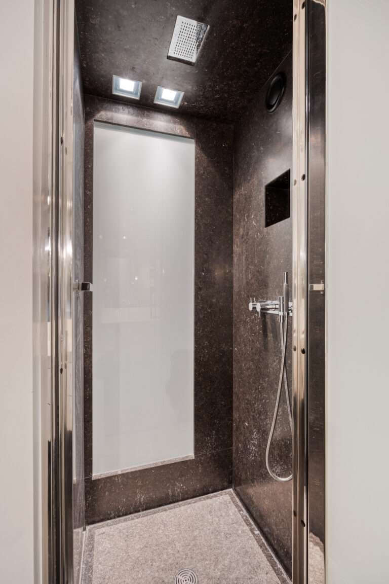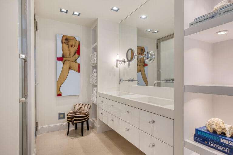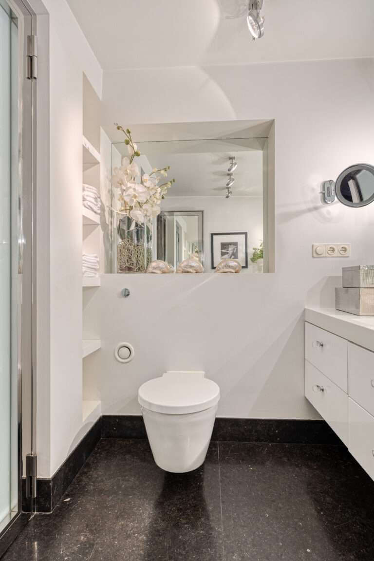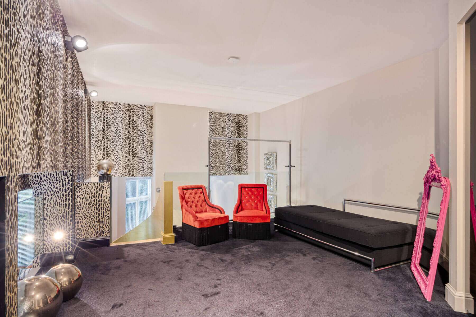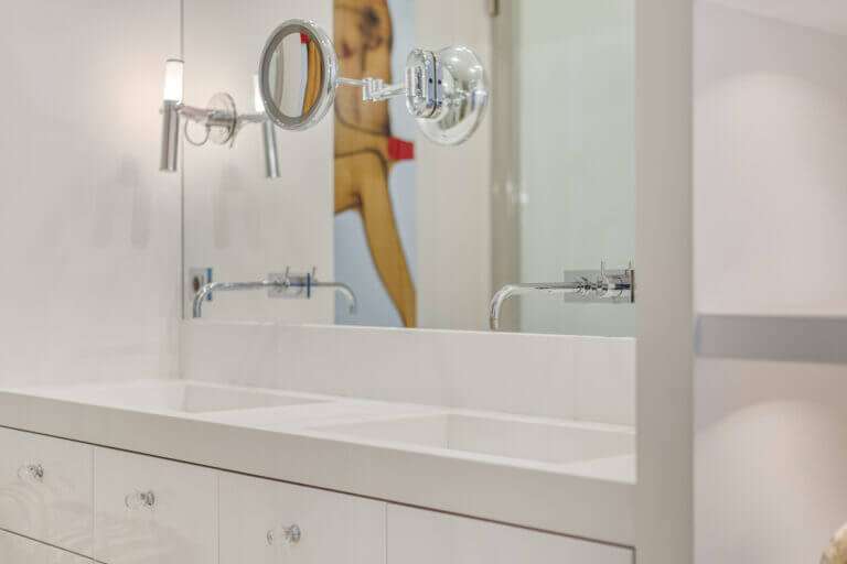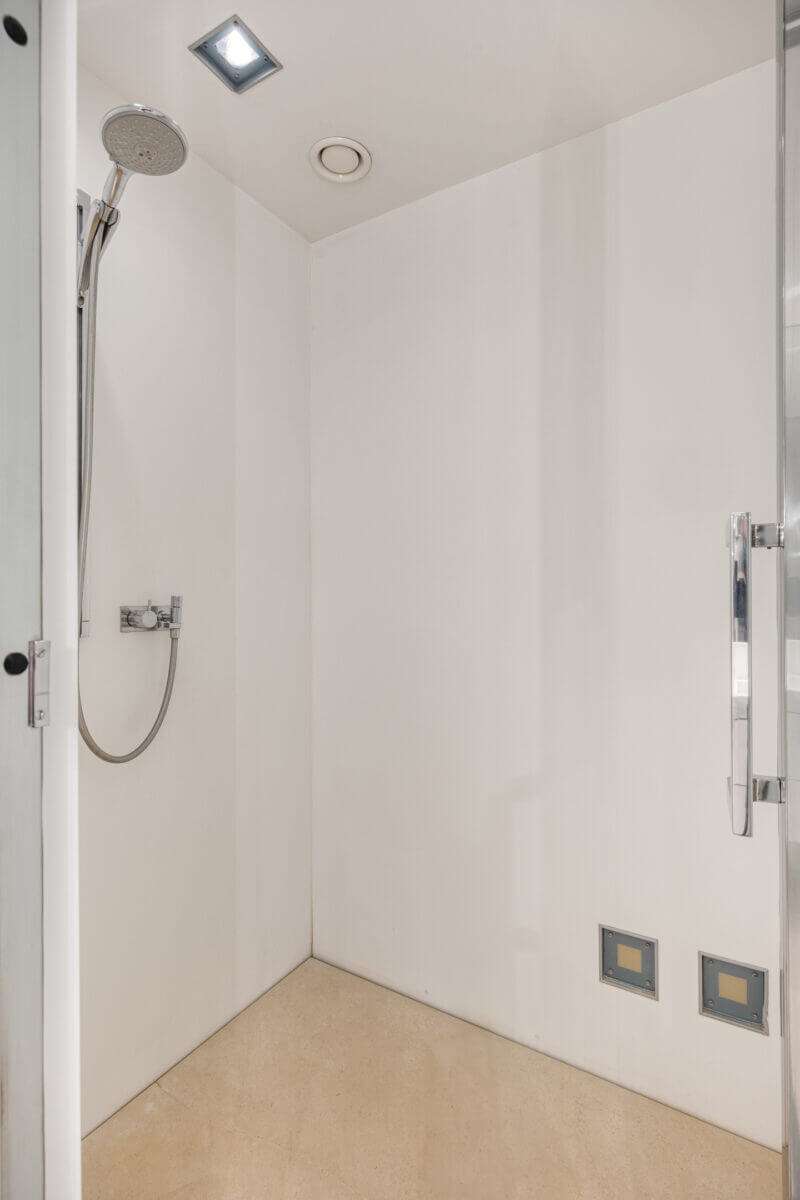 Via een spiltrap bereikt u de entresol, welke bijvoorbeeld gebruikt worden als tweede slaapkamer of als werkkamer. De entresol heeft veel kastruimte en biedt toegang tot de tweede badkamer, welke eveneens is voorzien van dubbele wastafels, inloopdouche en apart toilet.