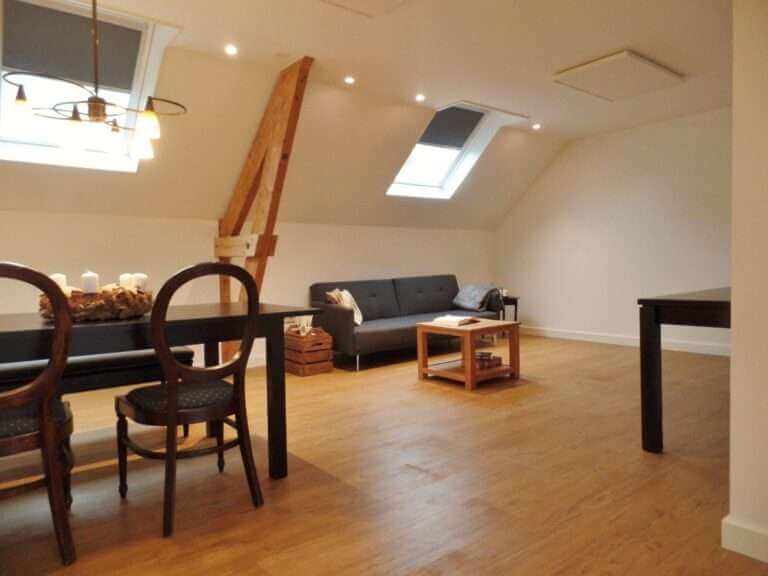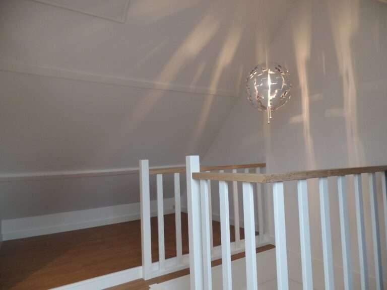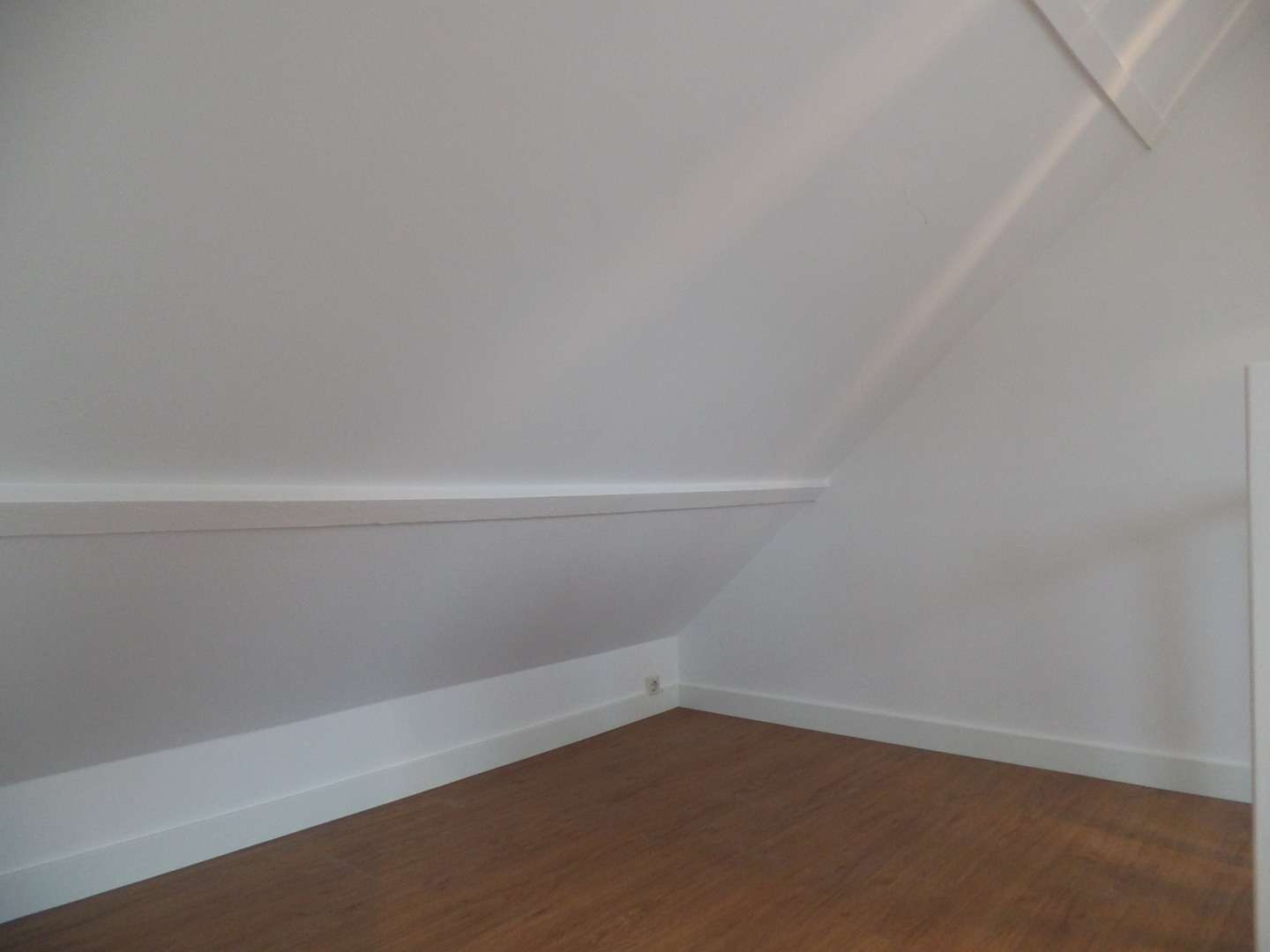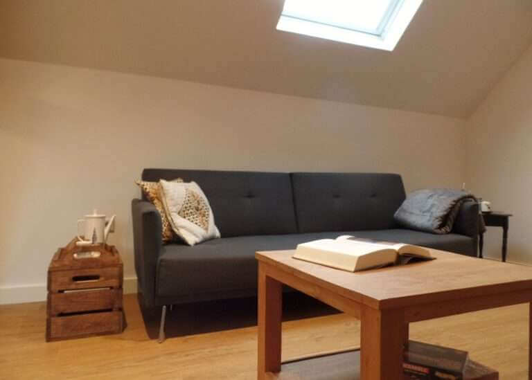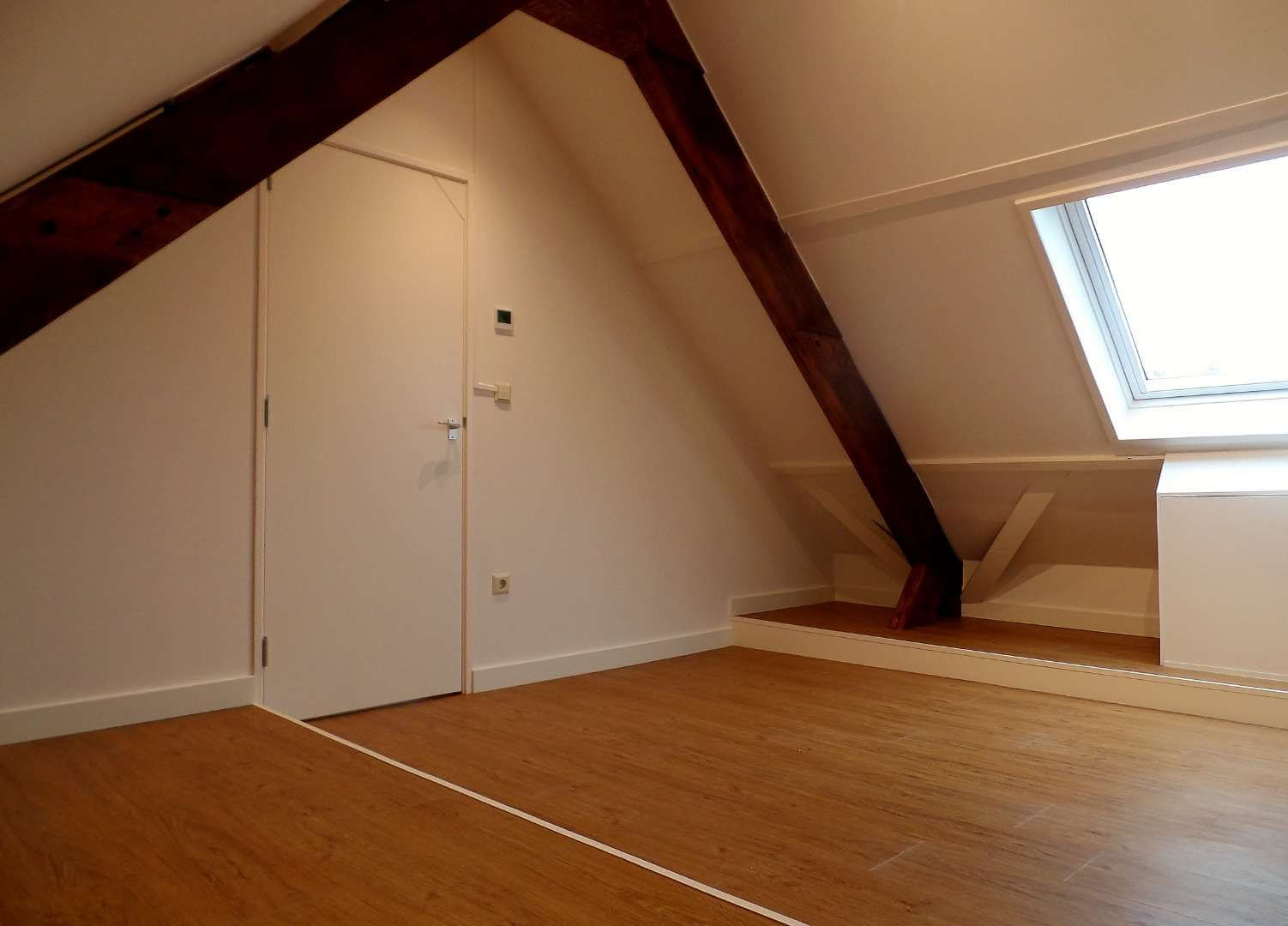 Overloop met ruimte voor een logeerbed en velux dakraam, ruime slaapkamer met velux dakraam.