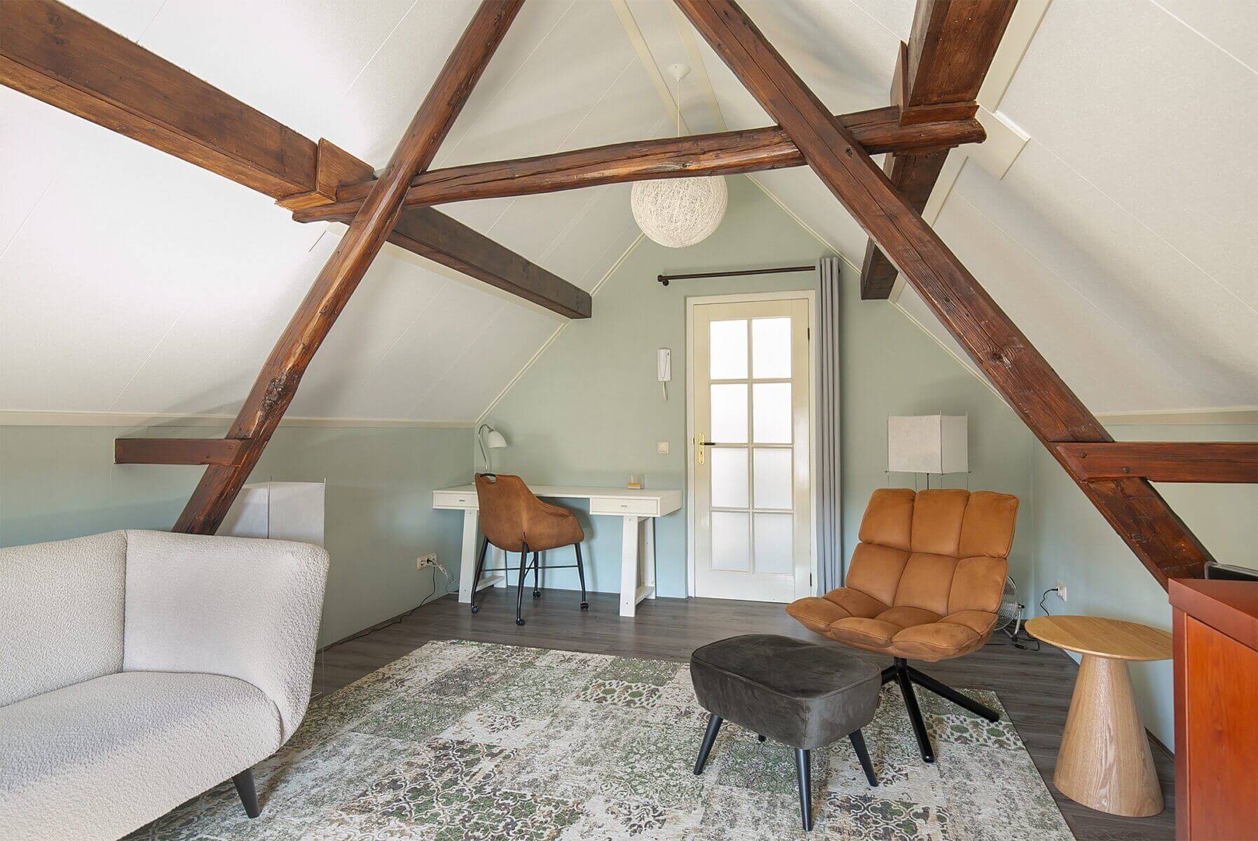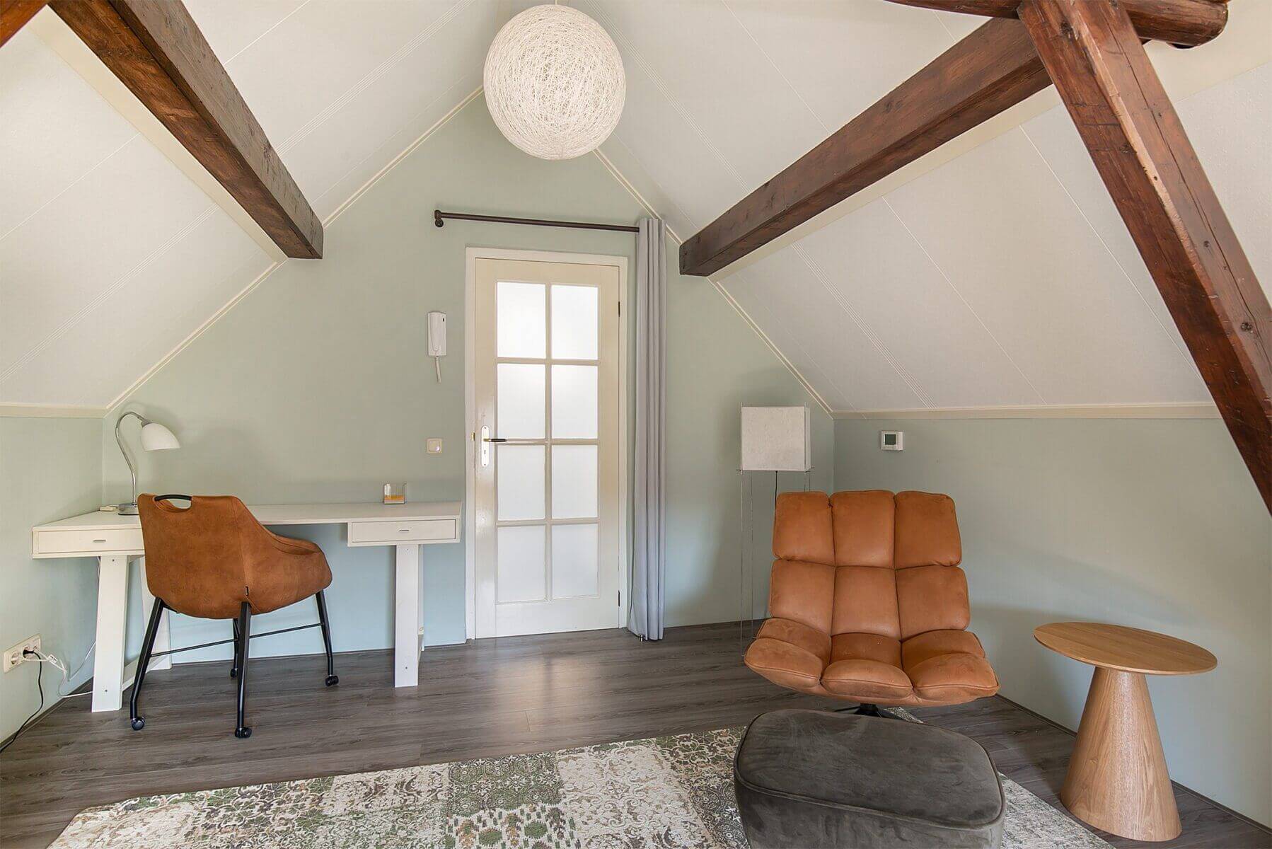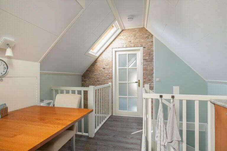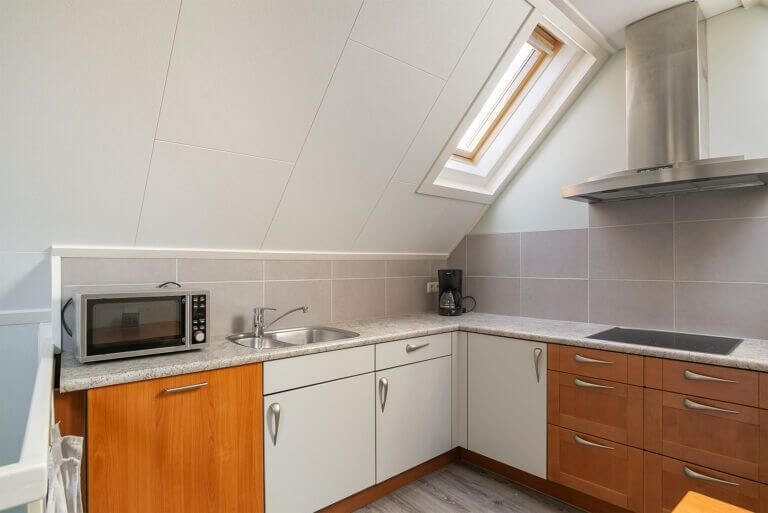 terug naar de overloop op de 1e verdieping bereikt u via een vaste trap het woongedeelte met gezellige woonkamer en open keuken op de 2e verdieping De keuken is voorzien van diverse inbouwapparatuur, zoals een vaatwasser, keramische kookplaat, afzuigkap, gootsteen, koelkast met vriesvlak en een vrijstaande combi oven magnetron.